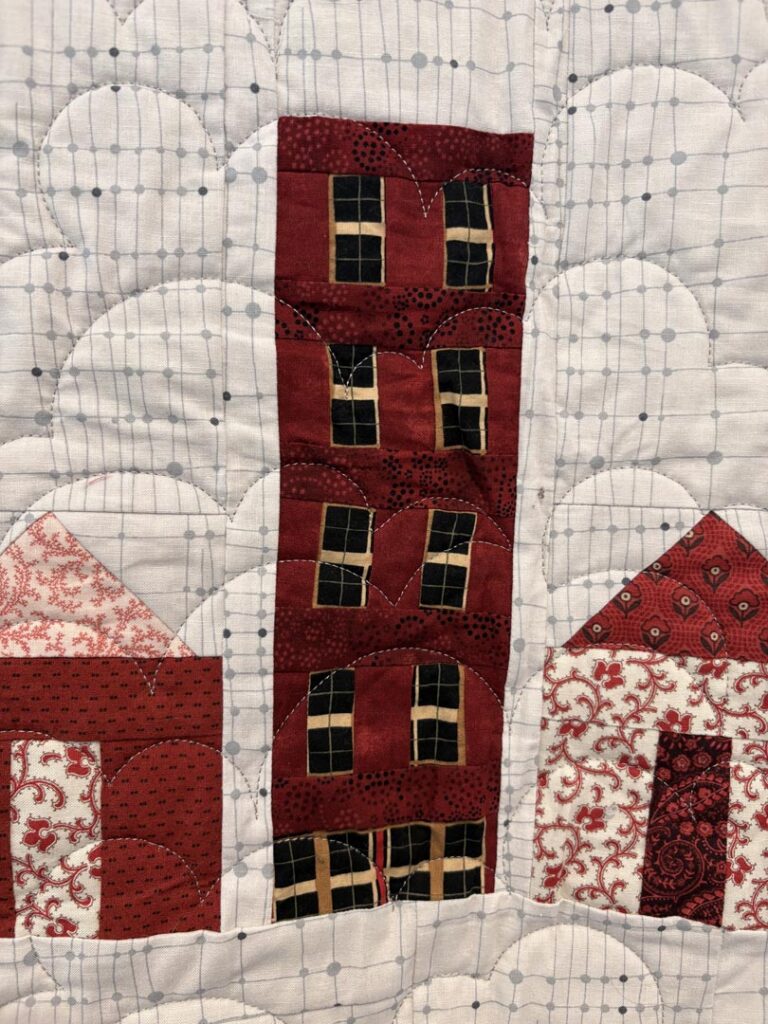 The inspiration for Connections in Community came from both her materials and her surroundings. Using red and white fabrics from her collection, Grace designed a village scene with houses, a church, and small details that reflect everyday life. The imagery is distinctly Canadian and if you look closely, you’ll even see 544 Bridgeport!